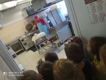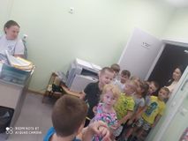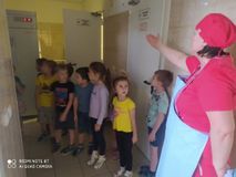 Увлекательно про работу кухни рассказала шеф-повар Варвара Юрьевна - дети увидели куда и в каких объёмах поступают продукты, а также где они хранятся. Узнали, что существуют горячий и холодные цеха, посмотрели в каких котлах и духовках готовится пища и кто и за что отвечает на кухне. Ребята посетили прачечную - и оценили масштаб используемой техники, заглянули в мастерскую рабочего по зданию, застали за работой Ольгу Павловну - "фею чистоты".